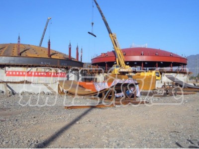 胀圈采用25c型槽钢滚弧后对扣焊接,胀圈的外弧应与罐壁的内弧半径一致。胀圈分段制作,通过32t千斤顶胀紧在罐壁板内侧下部,在犯t千斤顶处和每个提升支柱的两侧胀圈上,均需加设龙门板防止胀圈扭曲和翻转。